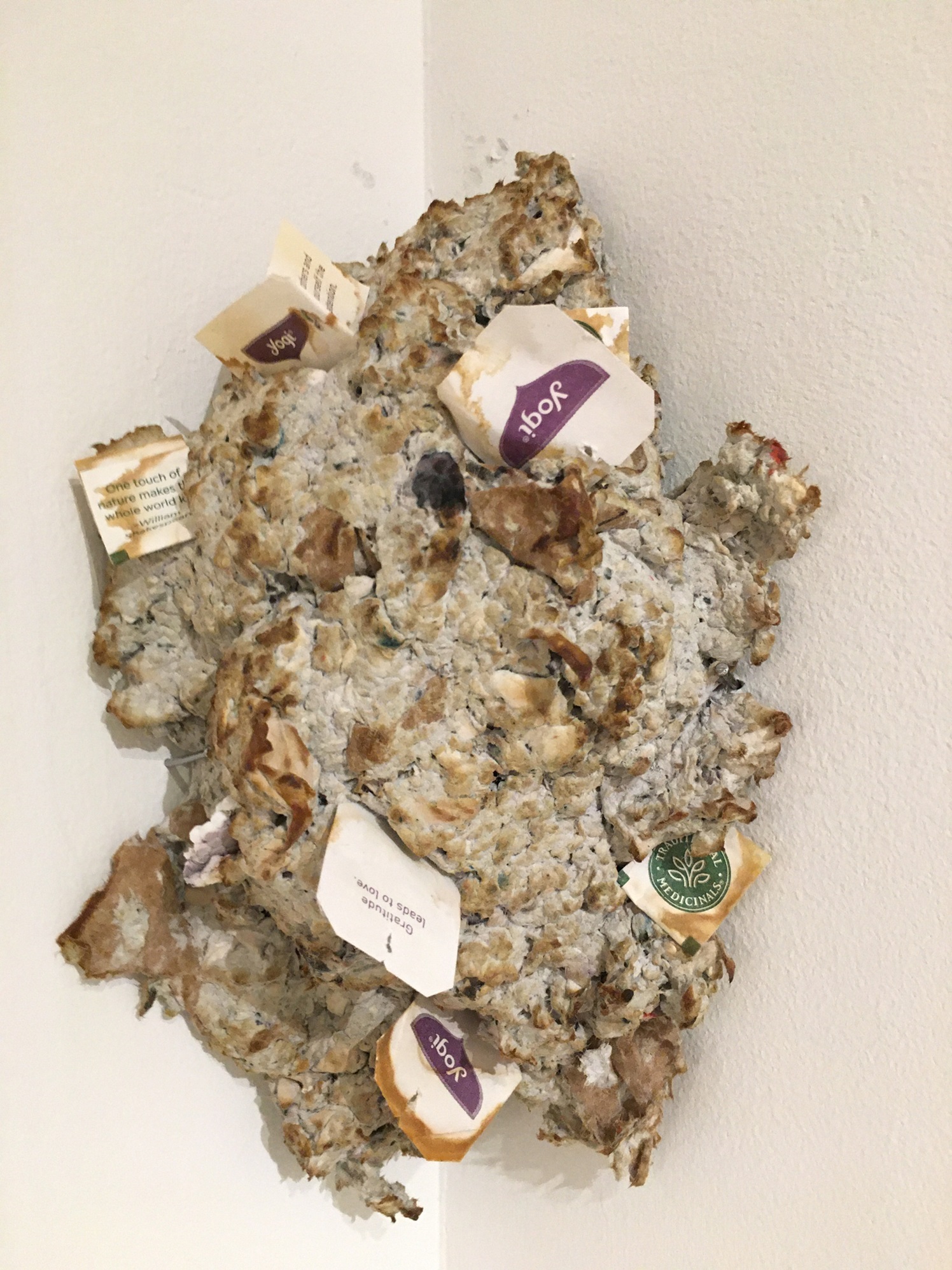 Yogi Tea is Stressfull, yogi tea tags, recycled New Yorker magazines, 2023.